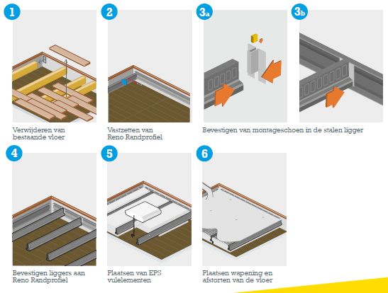 VBI PS-renovatievloer, stalen I-liggers en EPS-elementen (droog systeem of nat, naar keuze)
