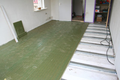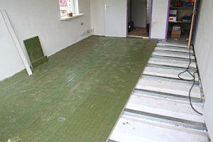 - Nat systeem, d.w.z. er wordt beton gestort en een afwerkvloer van zandcement o.d. Denk wel aan de vrij lange wachttijd i.v.m. harding en droogtijd van beton en zandcement, zeker voor renovatie.