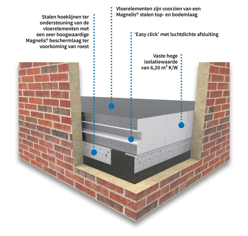 - Droog systeem d.w.z. er wordt geen beton gestort en geen zandcement afwerkvloer.