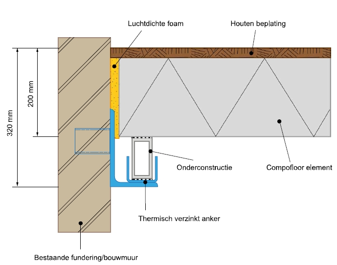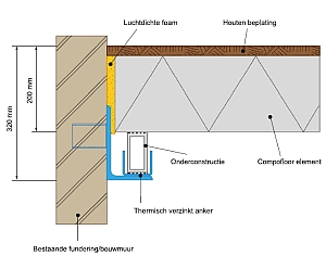 compofloor met draaganker aan fundering/bouwmuur, draagkoker (onderconstructie), compofloor element en osb4 afwerking (compofloor):![]() |