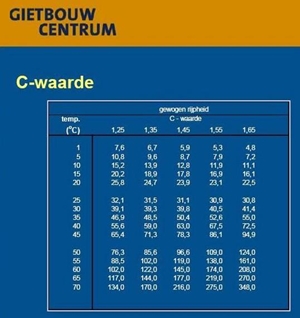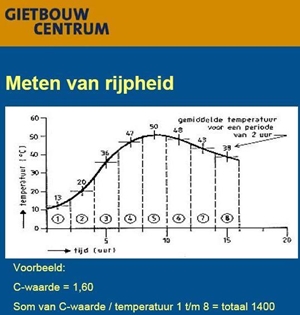 rijpheid van hardend beton bij een bepaalde c-waarde en een bepaalde temperatuur (de betonpocket van betonhuis): ![]() |