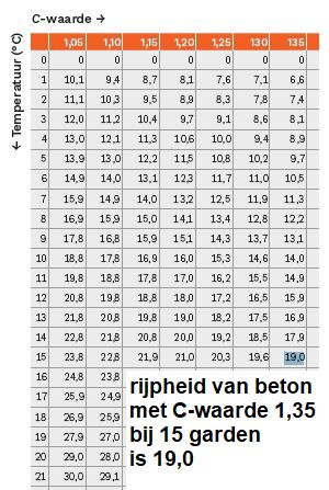 Voor de volledige uitwerking zie De Betonpocket van Betonhuis (pdf, p. 119 gewogen rijpheid en tabellen rijpheid per C-waarde en temperatuur vanaf p. 122).