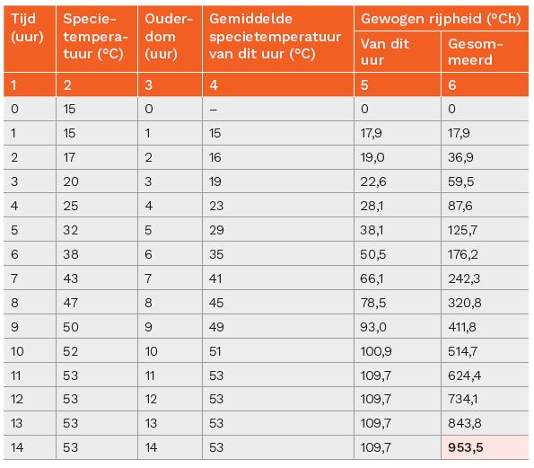 - Als alle kolommen en rijen zijn gevuld, dan geeft de laatste gesommeerde waarde de gewogen rijpheid aan (hier: ca. 953).