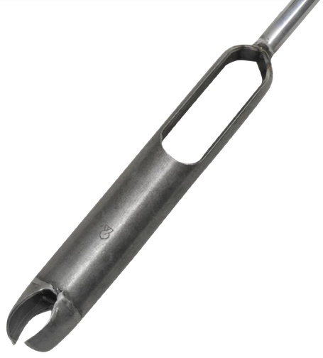 wordt de Riversideboor gebruikt (zie figuur). Het boorlichaam bestaat uit een open buis (1) met daaronder twee