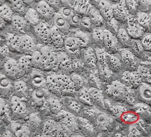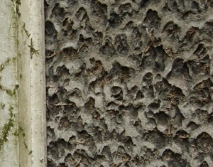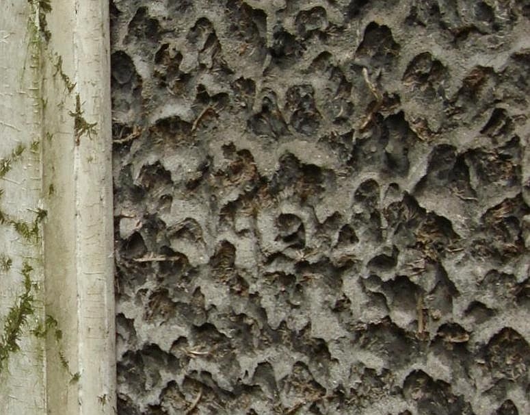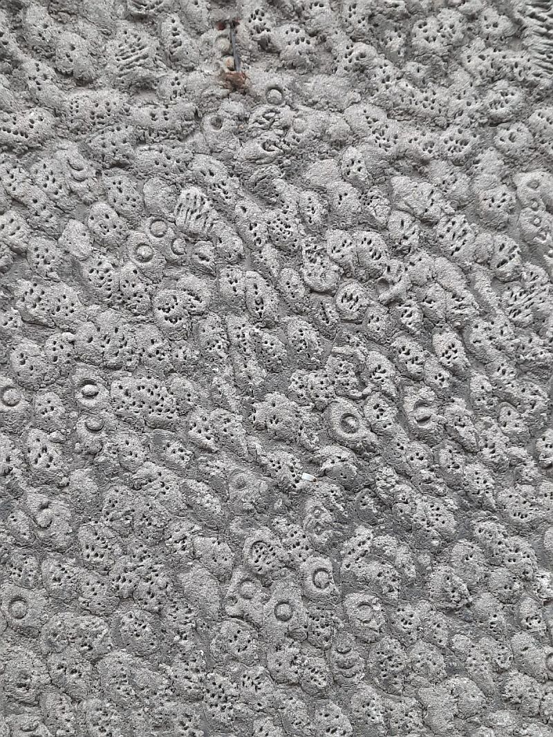 een speciale vorm van rotspleister, met heuveltjes en kleine kringen (alsof er met een elektriciteitsbuisje even in gedrukt is); de grootte van de heuveltjes is te zien aan de snoerclip rechtsonder; bakkerstraat, scherpenisse, tholen; klik voor de volledige afbeelding (copyright dig keur): ![]() |