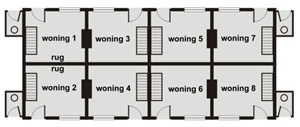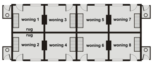 - de woningen die in een blokje van vier zijn gebouw en in twee muurvlakken muuropeningen hebben en met twee muurvlakken aan buren grenzen