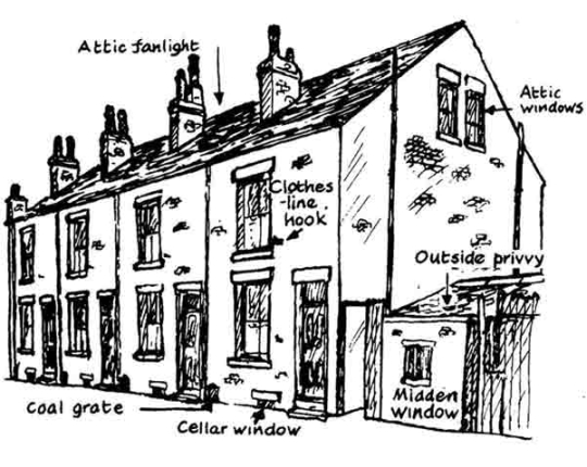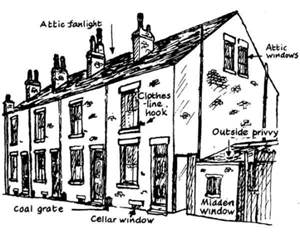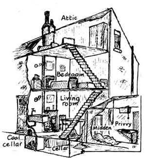 klik op de meeste afbeeldingen voor groter rug-aan-rug-woningen op een rij; duidelijk is dat er slechts bij één gevel muuropeningen waren; het toilet is op deze tekening buiten het gebouw; vaak was er een doorgang tussen de huizenblokken of een doorsteek (niet op de tekening) (university of the west of england / bristol): ![]() |