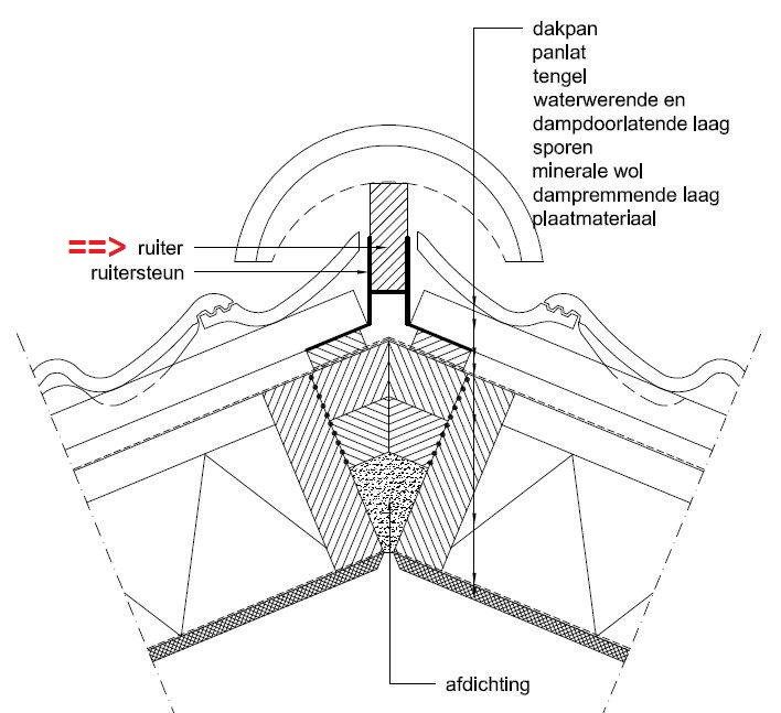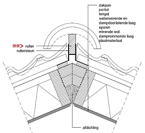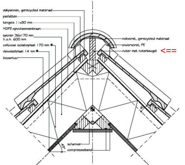 nokdetail van een ruiter met ondervorst, nokvorst, dakpan, panlat e.d.; klik voor groter: ![]() |