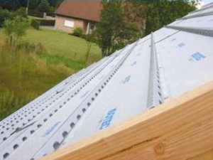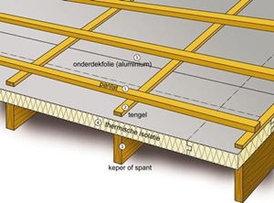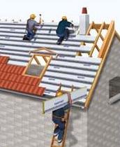 het principe van de dakopbouw met waterkerende, dampopen onderdakfolie; "koramic onderdakfolie: waterkerende, dampopen membramen voor toepassing op hellende daken en aan gevels met dakpannen; de folie breng je direct aan op het dakbeschot of op de tengels"; klik voor groter (wienerberger koramic onderdakfolie): ![]() |
