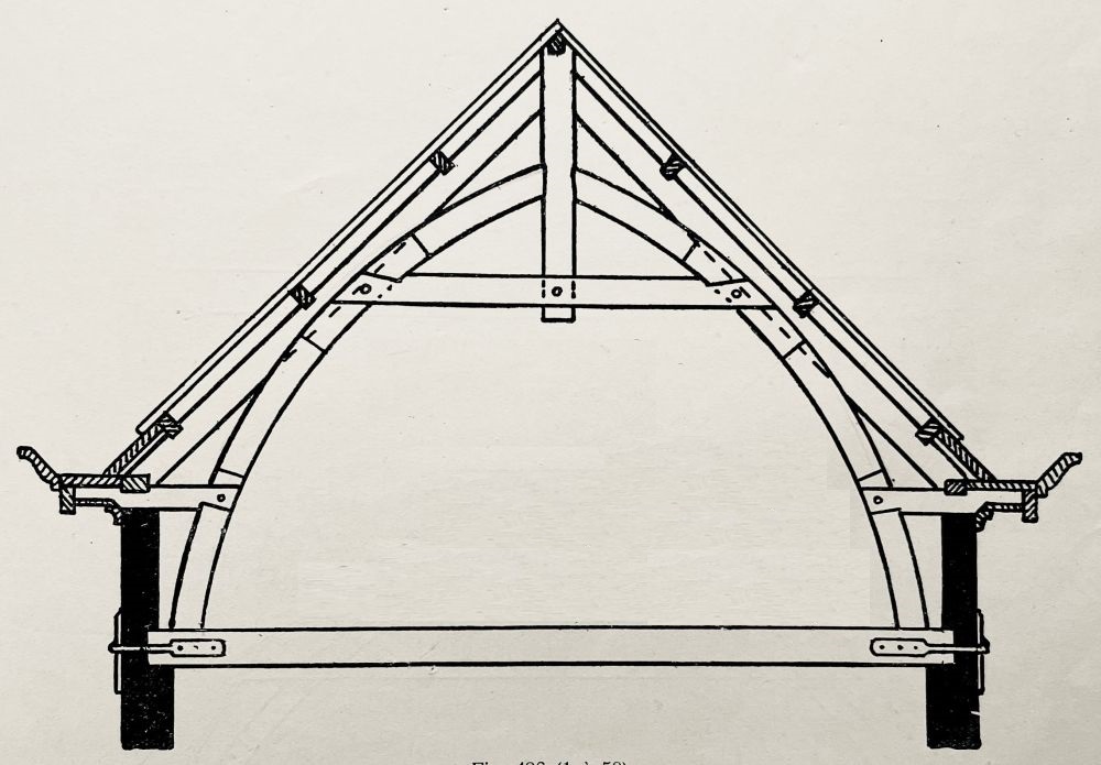 schenkelspant of philiberspant, schenkels raken elkaar bovenaan via de makelaar; klik voor groter (handboek voor timmerlieden, h.j. de groot, 1914; pdf vanaf p. 252): ![]() |
