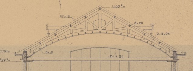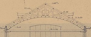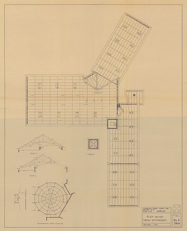 ook wel een schenkelspant of philiberspant te noemen, hoewel het ook een combinatie van een ardant-spant en een engels spant lijkt, in ieder geval een soort vakwerkspant, stedelijk gymnasium leiden, fruinlaan 15, ca. 1936; klik voor groter (erfgoed leiden): ![]() |