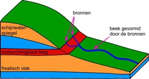 schijnwaterspiegel bij een ondoordringbare laag; bronnen kunnen ontstaan door het "sijpeleln" van water door de toplaag; klik voor groter (physical geography): ![]() |