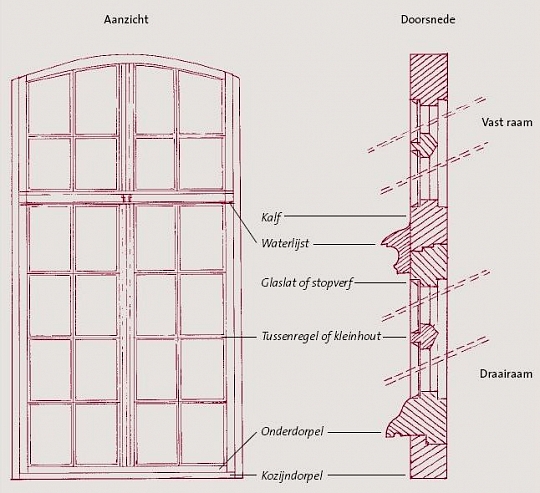 buitenschrijnwerk van een raam, met kalf, waterlijst, glaslat of stopverf, tussenregel of kleinhout, onderdorpel met waterhol en kozijndorpel; klik voor groter! (uit brochure monumentenwacht belgië): ![]() |