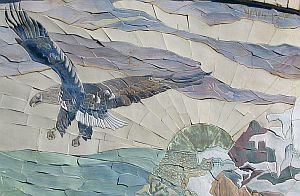 een tegeltableau met vooral niet-rechthoekig gesneden tegels.