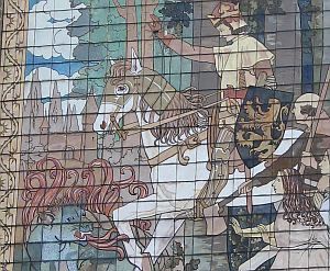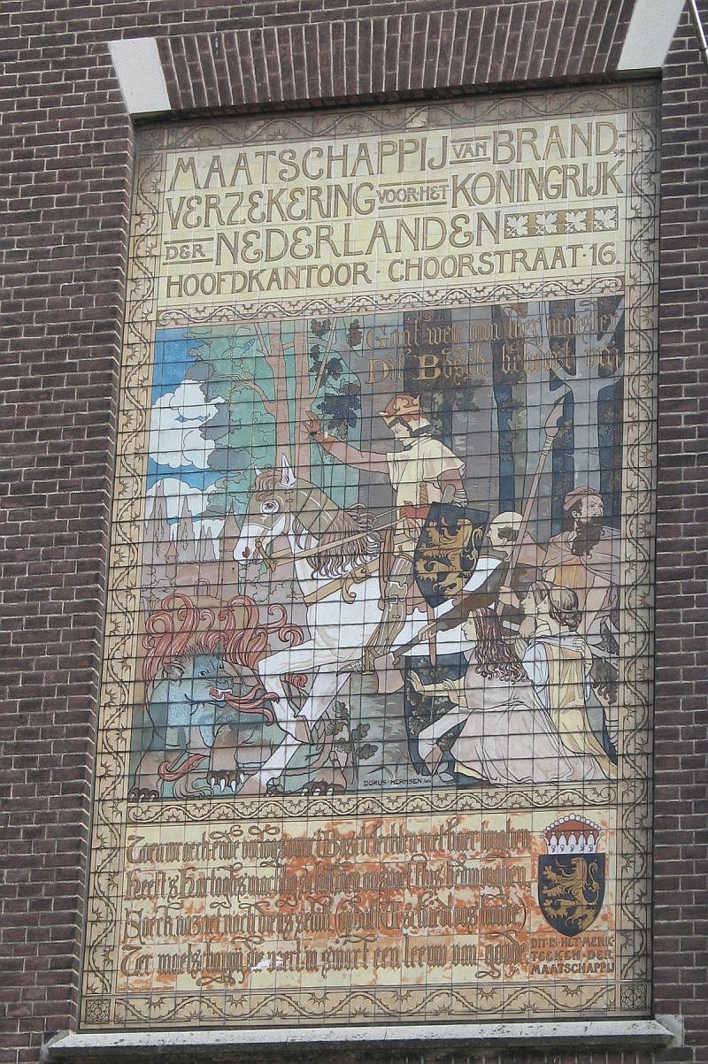 géén sectieltableau maar een tegeltableau met louter vierkante tegels waardoor het raster afleidt van de voorstelling; "tableau uit 1910 aan een gevel in den bosch, gemaakt door dorus hermsen en voorstellende hendrik i van brabant (detail van foto basvb, wikipedia): ![]() |