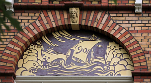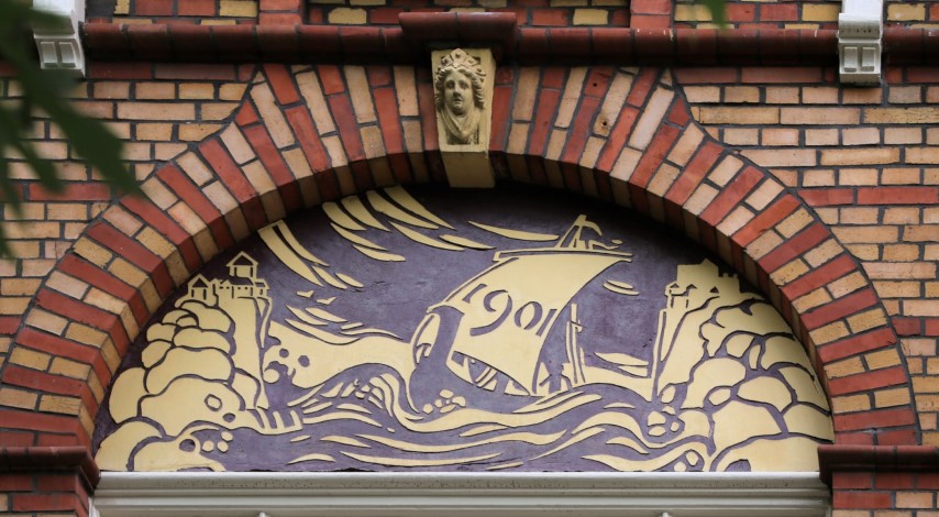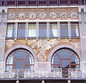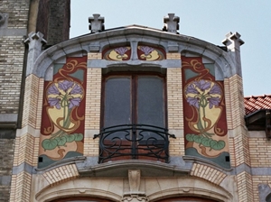 gedetailleerde sgraffiti uit de jugendstil, hôtel ciamberlani, elsene, brussel, arch. paul hankar, 1897; klik voor groter (ben2, wikipedia): ![]() |