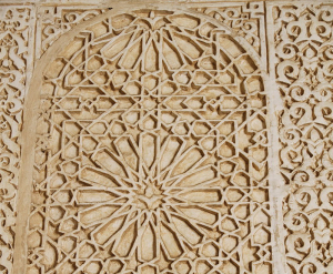 yesería (schrijfwijze van de spaanse term): geen aparte kleur voor de ondergrond, vrij hoog reliëf, detail van moors stucwerk in patio del cuarto dorado, alhambra, granada (foto shesmax, wikipedia): ![]() |