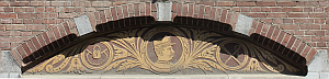 sgraffito's werden en worden toch ook vaak in slechts twee kleuren uitgevoerd (één of twee stuclagen, meestal de onderste laag gekleurd) yezeria-sgraffito als boogvulling, spoorweglaan 7, maastricht, 1901; klik voor groter! (foto wim den hertog): ![]() |