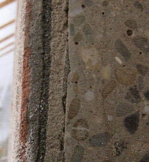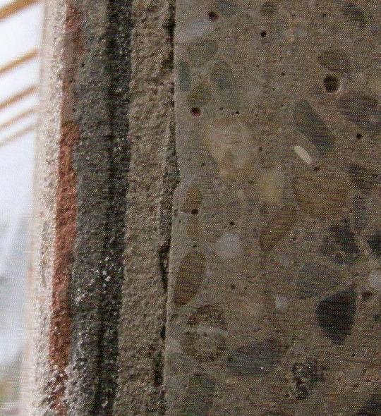 lagenpakket van een sgraffito "ziekenhuisbezoek" van lex horn, 1965, foto rutger morellisen, boek stuc kunst en techniek (grote pdf cultureel arfgoed) van rechts naar links beton, dunne plaklaag, raaplaag, zwart, donkergrijs, rood, wit; klik voor groter: ![]() |