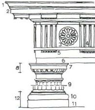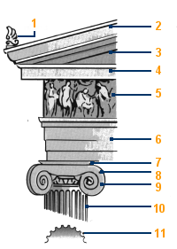 Legenda bij de tekening: 1. akroterion 2. sima of cimaas (bovenste deel van fronton of fries) 3. timpaan 4. geison 5. fries 6. architraaf 7. abacus 8. echinus 9. voluut 10. zuilschacht 11. cannelures |