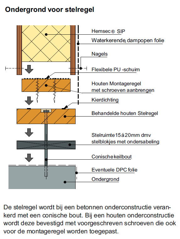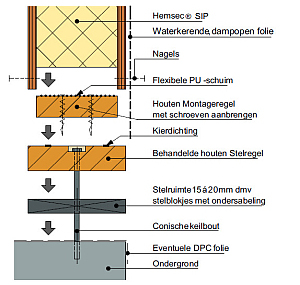 hemsec-sips; opbouw onderzijde sip bij bevestiging in beton met een conische keilbout door behandelde houten stelregel, stelblokjes met ondersabelingen; bij een houten ondergrond is de bevestiging met voorgeschreven schroeven; klik voor groter (hemsec sips supply): ![]() |