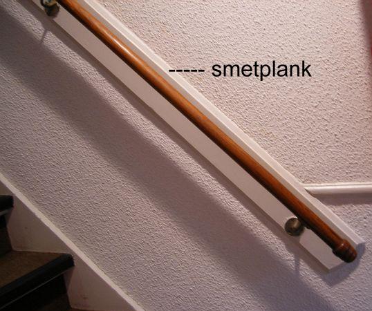 1. Ook: leuningplank. Een smetplank is een plank waarop de trapleuning, beter gezegd de leuningdrager, aan de muurzijde bevestigd wordt. Deze plank voorkomt het vuil worden van de muur en is gemakkelijk schoon te maken.