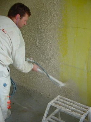 - de eerste laag wordt gespoten en vlak getrokken (het zogenoemde afreien of afmessen) zodat het lijkt alsof het een gestucte wand is waardoor alle fouten in de muur zijn verdwenen