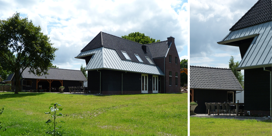 "spiegel" bij een dak van pannen en metaal, boerderijwoning hurwenen met dakvlakken die goed in een landelijke omgeving passen; klik voor groter (joustrareid architecten): ![]() |