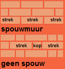 Strekken (hele stenen) achtereen: bijna altijd spouwmuur (het buitenblad is halfsteens en dus zijn koppen onhandig). Op de hoeken kunnen andere dan strekken liggen.