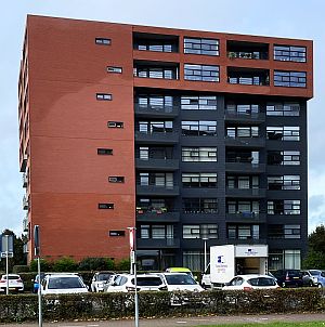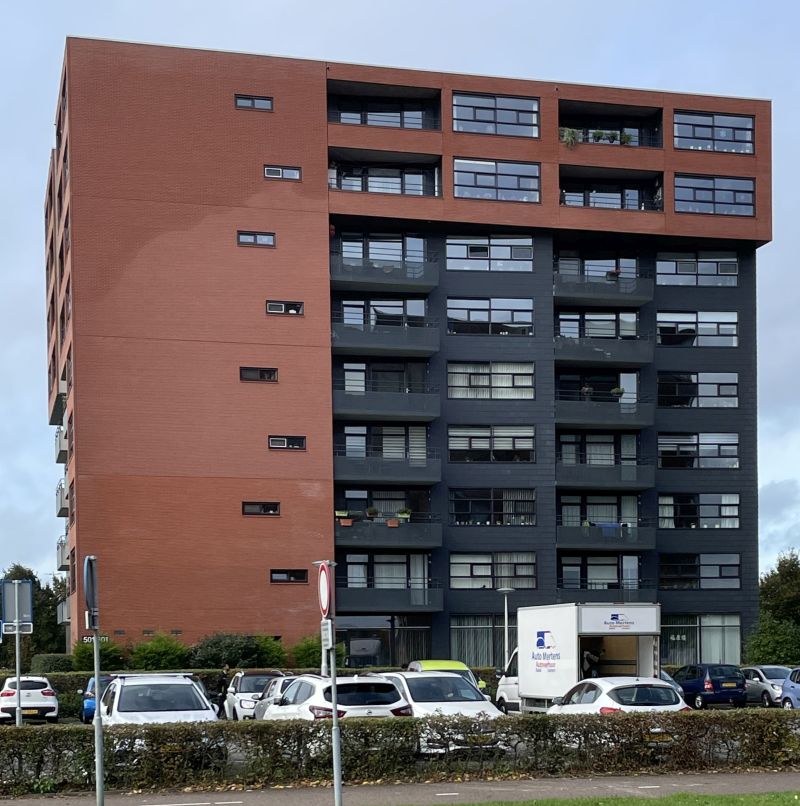 het nut van een spouwmuur is duidelijk wanneer het buitenblad na een fikse regenbui voor een deel doordrenkt is van hemelwater (gevel van onderste verdiepingen lijkt ook enigszins doordrongen van hemelwater maar is waarschijnlijk simpelweg verkeerde kleur of soort baksteen); klik voor groter (foto joostdevree): ![]() |