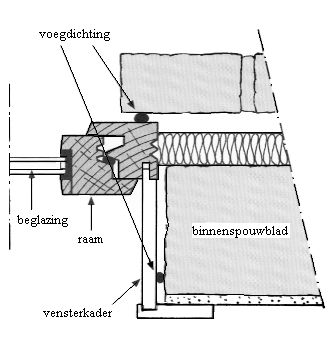 voorbeeld van een spouwmuur (buitenblad en binnenblad en alles ertussen) bij een raamkozijn: ![]() |