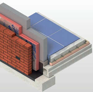 spouwmuur met in de spouw een isolerende spouwplaat en op de draagvloer een isolerende vloerplaat; klik voor groter (het roze isolatiemateriaal is kooltherm k8 resp. k3 van kingspan): ![]() |