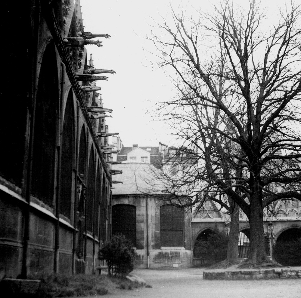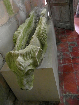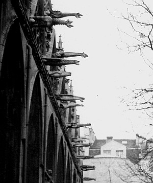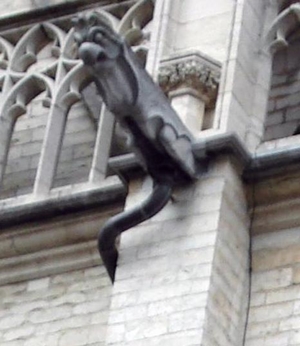 waterspuwer (gargouille), tempelierskapel laon, frankrijk, nabij de kathedraal; op deze foto is goed te zien hoe groot de waterspuwer is en hoe het hemelwater door de spuwer wordt afgevoerd naar de kop (copyright dig keur van o.m. vademecum de late middeleeuwen, uitgeverij profiel): ![]() |