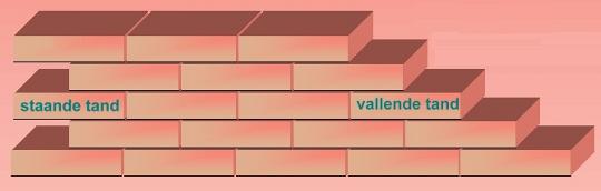 1. Staande tand is het verloop van de stenen in metselwerk waarbij de lijn een "staande figuur" laat zien (afbeelding van H. Nugter, Novacollege).