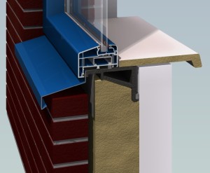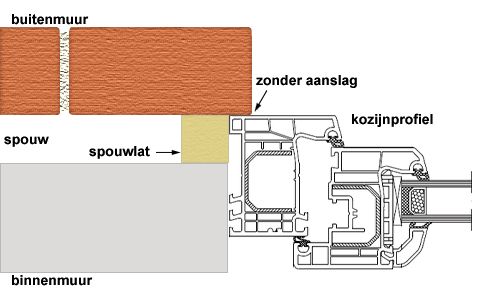 plaats van het houten stelkozijn met spouwlat, aanslag met rubber, geïsoleerd kozijnprofiel; de spouwlat verbindt de spouwbladen en het stelkozijn; klik voor groter (isolatie even weggelaten; kozijnenbestellen.com): ![]() |
