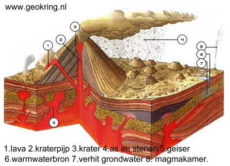 stollingsgesteente; lava, kraterpijp, krater, as en stenen, geiser, warmwaterbron, verhit grondwater, magmakamer; klik voor groter (geokring): ![]() |