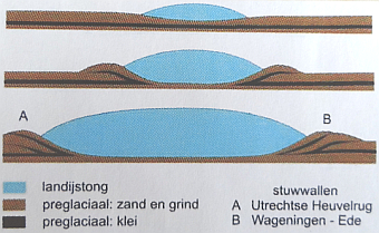 het ontstaan van stuwwallen bij de utrechtse heuvelrug en bij ede en wageningen, de landijstong duwt de grond weg waardoor zich wallen vormen (archeologie magazine 2013-01): ![]() |