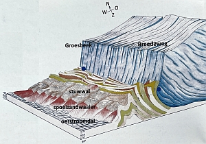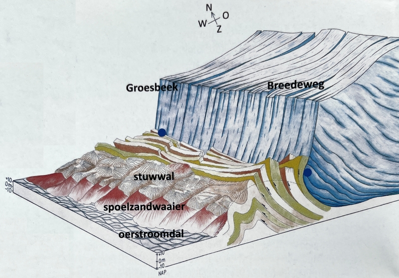 impressie van de stuwwal bij nijmegen, met spoelzandwaaiers en oerstroomdal; klik voor groter! (tekening fred kievits geodesign nijmegen / xander de jong, in conglomeraat 1-2025 van de lvga): ![]() |
