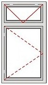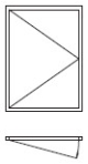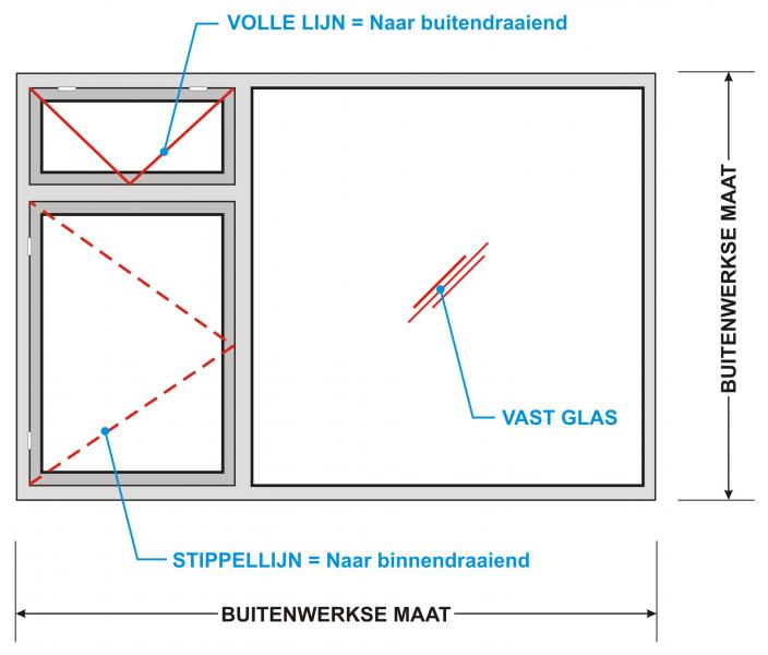 volle lijn = naar buiten draaiend stippellijn = naar binnen draaiend bovenlicht scharniert hier aan bovenzijde draairaam scharniert hier aan linkerzijde |