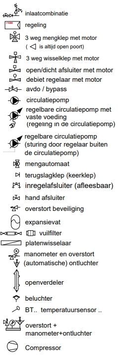 warmtepomp allerlei iconen (met dank aan nibe): inlaatcombinatie, 3-weg megklep met motor, 3-weg wisselklep met motor, open-dicht-afsluiter met motor, debiet regelaar met motor, avdo / bypass, circulatiepomp, regelbare circulatiepomp met vaste voeding (regeling in circulatiepomp), regelbare circulatiepomp (sturing door regelaar buiten de circulatiepomp), mengautomaat, terugslagklep (keerklep), inregelafsluiter (afleesbaar), hand afsluiter, overstort beveiliging, expansievat, vuilfilter, platenwisselaar, manometer en overstort, (automatische) ontluchter, openverdeler, beluchter, BT.. temperatuursensor .., overstort+ monometer + ontluchter, compressor |