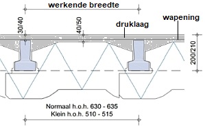 - Betrekkelijk geringe dikte (210 mm excl. druklaag en excl. onderuitstekende isolatielaag; incl isolatielaag en druklaag ca. 350 mm).