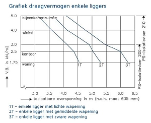 broodjesvloer met polystyreen, belasting (draagvermogen) en toelaatbare overspanning bij belasting van 175-500 kg/m2 (1,75-5,0 kN/m2) met lichte, gemiddelde of zware wapening van de liggers; klik voor groter (vbi): ![]() |