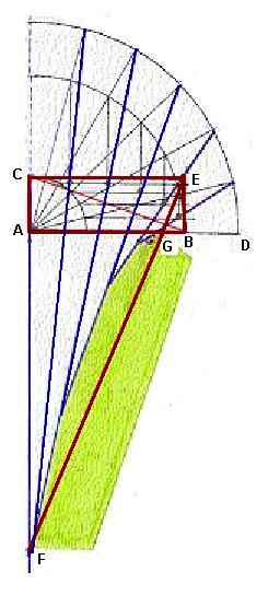 | uitzetten van de vlinder: - teken rechthoek B-A-C-E - teken diagonaal C-B - trek vanuit E loodrecht op C-B een lijn - op A-D vind je G - op de middellijn vind je F - trek lijnen vanaf de buitenste cirkel door de snijpunten die de ellips vormen naar de middellijn - zo krijg je een vorm van een vlinder - het porringpunt is punt F en loopt over de vlinder |