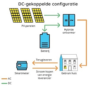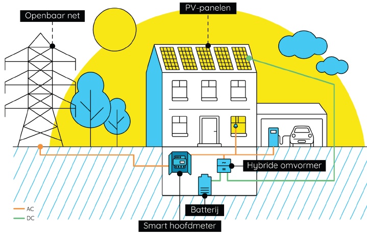Een hybride systeem is een systeem dat in gelijkstroom (DC) gekoppeld is aan de zonnepanelen (pv-panelen) en eventueel aan de batterij, terwijl de communicatie met het thuisnetwerk elektriciteit in wisselstroom gaat.