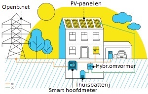 Er hoort een intelligent apparaatje en appje tussen zonnepanelen, elektriciteitskast, omvormer en thuisbatterij (thuisaccu, zonne-accu) te staan dat het nodige afvraag- en schakelwerk moet verrichten, afhankelijk van eigen verbruik, gevuld zijn van de batterij, elektriciteitsprijs energiebedrijf, mate van netcongestie e.d.: