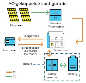 Bij een retrofit systeem is er een aparte omvormer voor de zonnepanelen en een aparte omvormer voor de batterij.