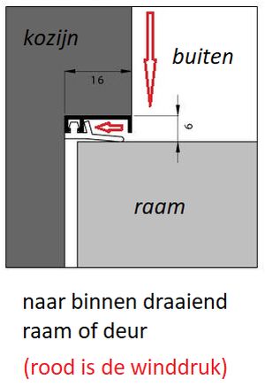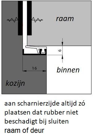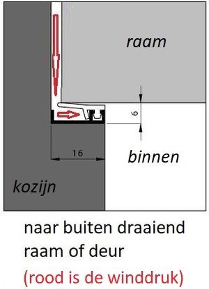 | juiste wijze van aanbrengen kozijnrubbers; let op de plaats van de open kant van het v-vormige rubber; de plaatsing is afhankelijk van de winddruk en daarmee van de draairichting van raam of deur; als voorbeeld een 16 mm brede sponning en 6 mm als sluitende opening tussen raam en kozijn (elton): aan de scharnierzijde raam of deur (wanneer je het profiel andersom plaatst, is de kans groot dat de afdichting bij het openen en sluiten achter raam of deur terechtkomt met als resultaat geen of slechtere afdichting en ook beschadiging van het profiel):    aan de niet-scharnierzijde (slot- en bovenzijde) voor een naar  buiten  draaiend raam of deur: aan de niet-scharnierzijde (slot- en bovenzijde) voor een naar  binnen draaiend raam of deur: |