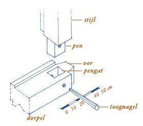 toognagel bij een pen-gat-verbinding bij een hoekverbinding van een stijl van een kozijn (cultureel erfgoed):![]() |