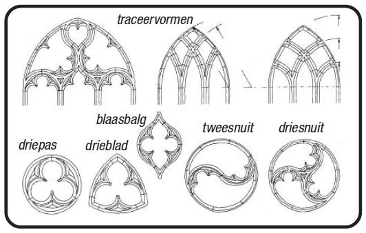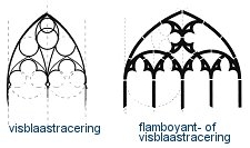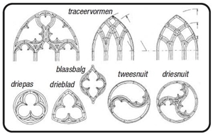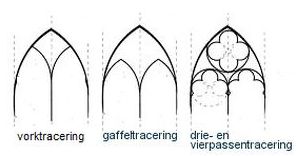 een paar traceringen; vorktracering (enkele vork), gaffeltracering, driepastracering, vierpastracering, visblaastracering, flamboyanttracering): ![]() |