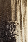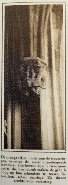 een draagkorf bij een tracering; de twee mannetjes geven de indruk dat zij de gehele boog dragen, klik voor groter (detail van foto van het utrechts archief, bron "icoon in de steigers, restauratie van de dom 2016-2024"): ![]() |